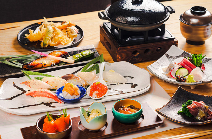 小鉢・お通し・刺身・柳川・寿司・汁物・デザート